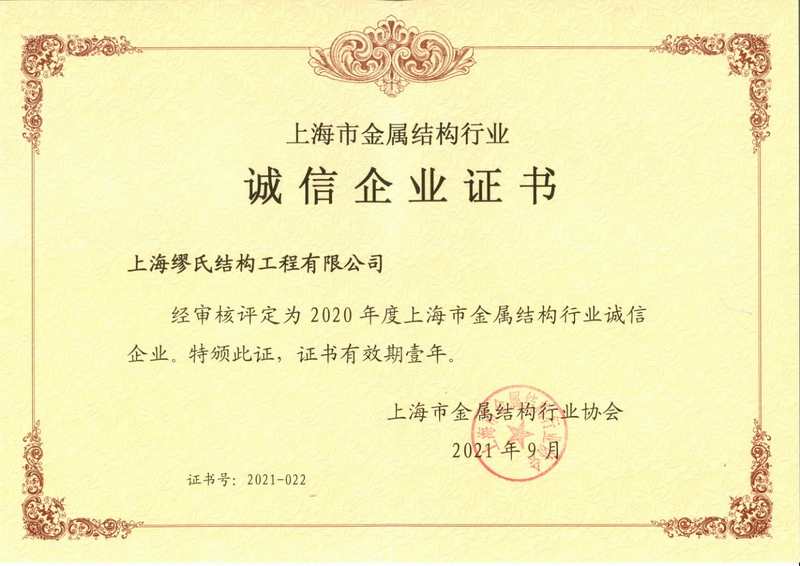 本次會議由上海市金屬結構行業(yè)誠信建設評價委員會審定并對年度優(yōu)秀企業(yè)和個人進行嘉獎,并向社會公示。上海繆氏結構工程有限公司通過自身行業(yè)自律,重視行業(yè)誠信體系建設,獲評“2020年度上海市金屬結構行業(yè)誠信企業(yè)”稱號??娛箱摌?/span>已連續(xù)多年榮獲此榮譽,今后必將再接再厲,為更高層次的目標發(fā)展。